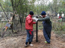 На данном участке изначально присутствовал только простой бетонный памятник и металлическое ограждение. Нам же необходимо было привести территорию могилы в полный порядок. Приступая к работе, мы первым делом вкручиваем определяющие фундамент сваи.