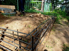 Затем мы приступили к подготовительному этапу установки ограды. Конструкция была объёмной, а потому было необходимо сначала сделать надёжный бетонный каркас. Мы выкопали траншею, а затем там, где это было необходимо, заколотили металлические сваи.