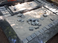 Предварительно застеленную геотекстилем территорию участка засыпаем пескобетонной смесью. На неё крепим основание зеркальных памятников, выставляем общий цветник, укладываем гранитную брусчатку.
