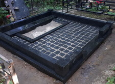 Так выглядит окончательный вариант места захоронения: памятники являются точной зеркальной копией друг друга, на землю уложена брусчатка, металлическое ограждение заменено на гранитный цоколь.