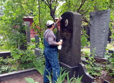 Практически сразу мы взялись за восстановление надписи: для этого её следовало покрыть специальным раствором. Перед тем, как приступить к надгробью, мы тщательно убрали на могиле: пропололи растущие у основания памятника цветы, а также убрали с территории участка весь мусор, который в последствие был вывезен с кладбища.